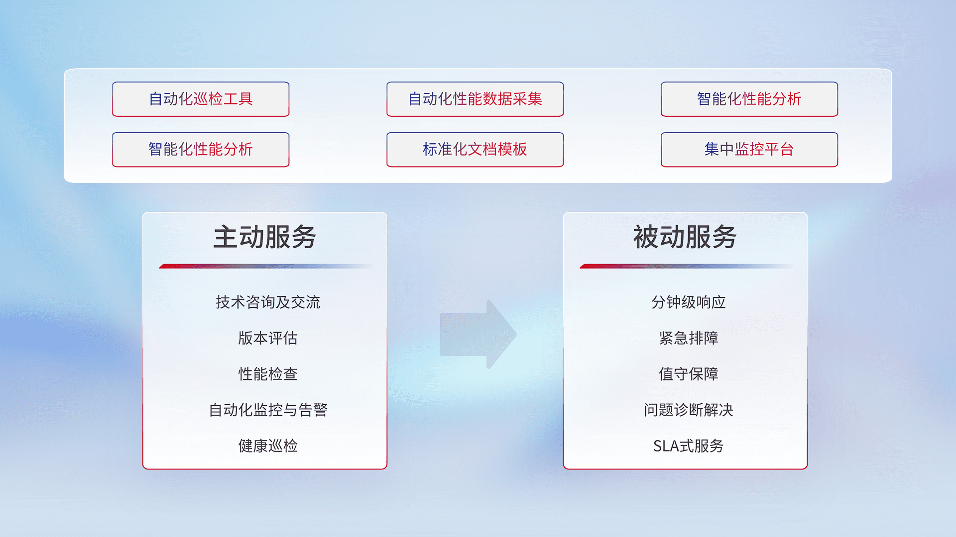 智能化工具和标准化文档,,,保障服务质量,,,提供主动服务(包含技术咨询、、、、版本评估、、、性能检查、、、自动化监控与告警、、、、健康巡检)和被动服务包含(分钟级响应、、、紧急排障、、值守保障、、、、问题诊断解决、、、SLA服务)。。